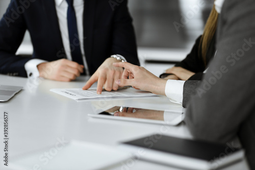 Unknown businessmen and woman sitting, working and discussing questions at meeting in modern office, close-up