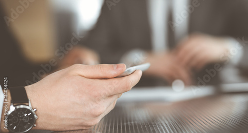 Unknown businessmen and woman sitting, working and discussing questions at meeting in modern office, close-up