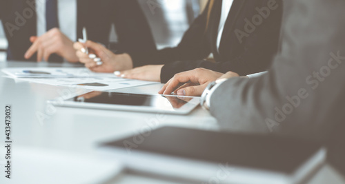 Unknown businessmen and woman sitting, working and discussing questions at meeting in modern office, close-up