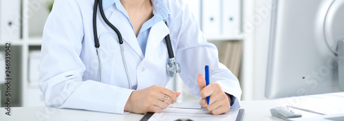 Unknown female doctor working at the desk with clipboard in hospital and filling up medical history form, close-up view. Medicine concept