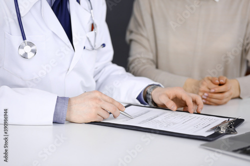 Unknown male doctor and patient woman discussing something while sitting in clinic and using clipboard. Best medical service in hospital, medicine, pandemic stop