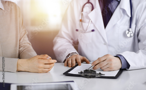 Unknown male doctor and patient woman discussing something while sittingin a darkened clinic and using clipboard, glare of light on the background