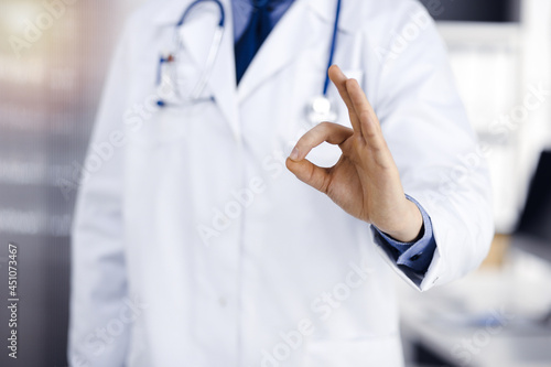 Unknown male doctor standing straight with OK sign in sunny clinic, closeup. Perfect medical service in hospital. Medicine and healthcare concept