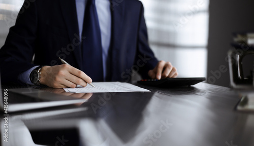 Unknown man accountant in blue blazer use calculator and computer with holding pen on while staying at home during covid pandemic. Taxes and audit concept
