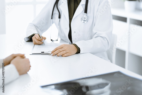 Unknown woman-doctor and female patient sitting and talking at medical examination in clinic, close-up. Therapist wearing green blouse is filling up medication history record. Medicine concept