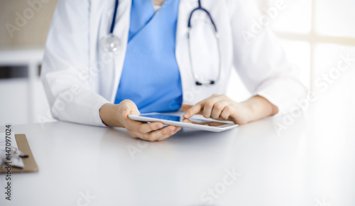 Unknown woman-doctor sitting in sunny clinic and using tablet pc, close-up. Data and best service in medicine