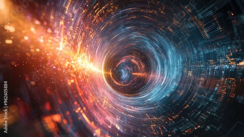 Unmanned aerial vehicle view of a swirling, vibrant digital vortex with sharp technology lines and a dynamic flow of digital energy