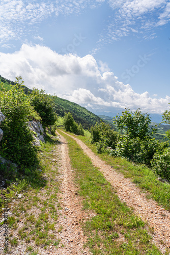 Unpaved road through the hilly landscape of the Croatian Mountains.