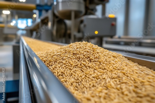 Unprocessed rice grains move along a metal conveyor belt, inside a food processing factory, for cleaning and packaging.