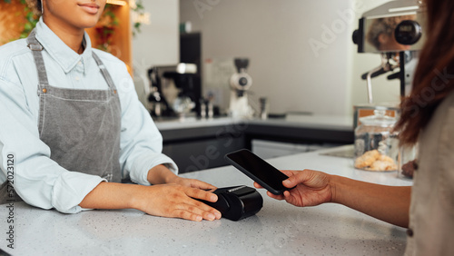 Unrecognizable customer paying by NFC at a cafe. Barista holding pos terminal while receiving payment.