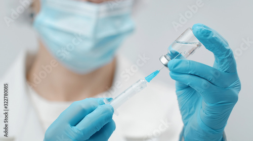 Unrecognizable doctor wearing medical protective mask and blue nitrile gloves fills syringe, cropped