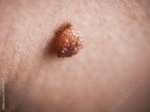 Unrecognizable person having dark fibroma, dermatology problem on skin. Close up of papilloma dermatosis