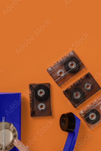 Unrecognizable person using old disk telephone with audio tape cassettes on orange background. Classic rotary phone and audio cassette, perfect for evoking retro nostalgia