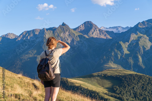 Unrecognizable woman standing on grassy hill slope against rocky mountains