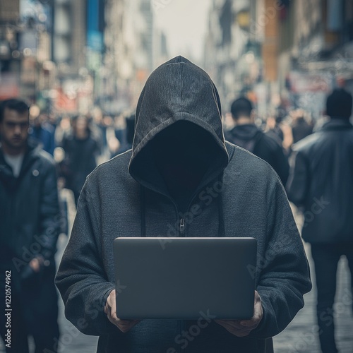 Unrecognizable young hacker in hoodie using laptop in blurry city. Business people. Concept of cybersecurity. Toned image double expsoure