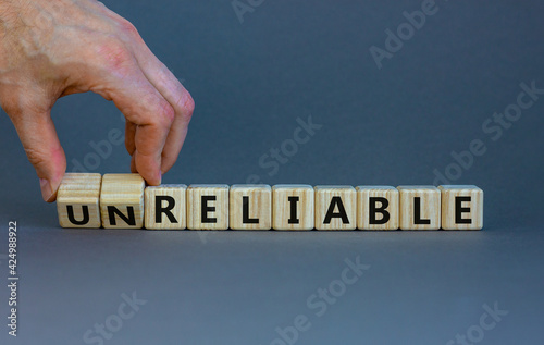 Unreliable or reliable symbol. Businessman turns wooden cubes and changes the word unreliable to reliable. Beautiful grey background, copy space. Business and unreliable or reliable concept.