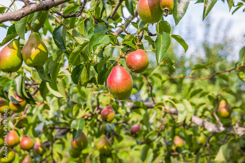 Unripe green and red pears. Young pear tree. Ripe fruit harvest. Summer.