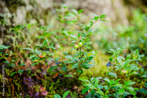 unripe green cowberry in the summer forest