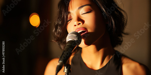 Unsung Voice: A woman singing into a microphone, wearing a simple black dress.