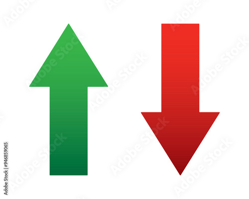 Up and Down sign with green and red arrows vector illustration. Concept of sales bar chart symbol icon with arrow moving down and sales bar chart with arrow moving up.