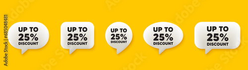 Up to 25 percent discount tag. 3d chat speech bubbles set. Sale offer price sign. Special offer symbol. Save 25 percentages. Discount tag talk speech message. Talk box infographics. Vector