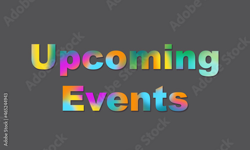 Upcoming Events! The word with bubble letters, the edges in grey and a soft shadow. Inside of the letters in multi color in watercolor optic. Background in grey.