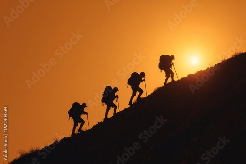 Uphill Climbing. Four Unrecognizable Silhouettes of Backpackers Trekking Towards Success