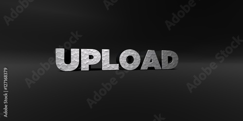 UPLOAD - hammered metal finish text on black studio - 3D rendered royalty free stock photo. This image can be used for an online website banner ad or a print postcard.