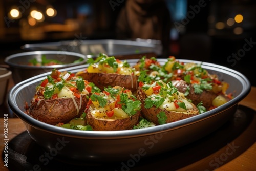 Upper sight of baked potatoes and vegetable salad, generative IA