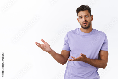 Upset and hesitant young male coworker discuss project with coworkers, pointing left, introduce awful bad result and looking disappointed camera, standing indecisive over white background
