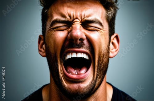 upset Caucasian man screaming and crying, closeup. shock and emotional breakdown, depression.