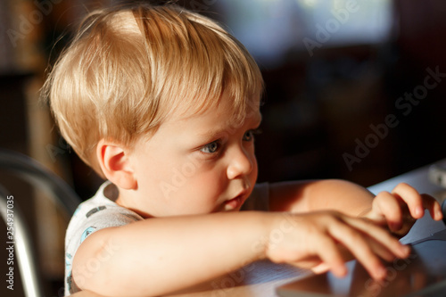 upset little boy sitting alone,Kid sad face looking out, Unhappy child looking out with thinking face, Cropped shot bored child face, Spoiled children