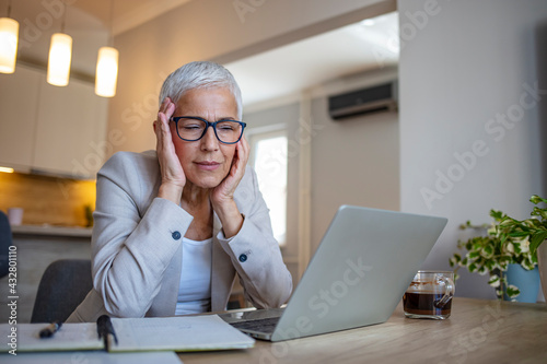 Upset, unhappy, pretty, charming, professional teacher feeling bad, took off glasses, touching her temple, suffering from headache, sitting at desk in workstation, having computer, tablet on the table