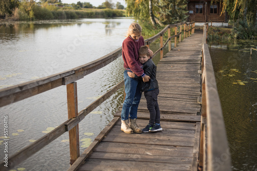 Upset young mother give comforting hug to crying little son. Handsome boy looks sad and little boy has to stay with mom because his dad and mother got separated or divorce. Cute boy looks tired