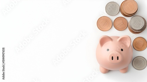 Upward Growing Coin Stacks Beside Pink Piggy Bank on Minimalist White Background Symbolizing Financial Growth Through Consistent Savings and Investment