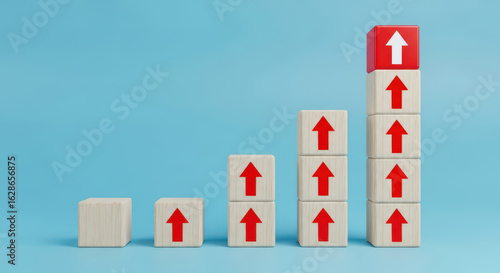 Upward Trend Represented by Stacked Wooden Blocks with Arrow Symbols, Signifying Business Growth and Positive Progression in Strategy and Development Planning