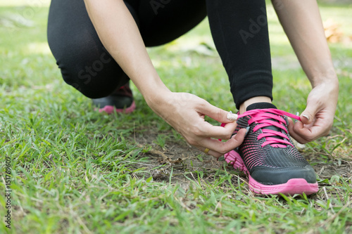Urban athlete woman tying running shoe laces. Female sport fitness runner getting ready for jogging outdoors on forest path in city park