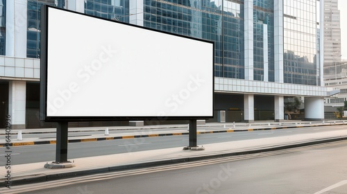 Urban Billboard in Cityscape, an empty roadside billboard framed by sleek modern architecture, highlighting the potential for urban advertising opportunities in a bustling metropolis.