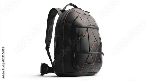 Urban black backpack with intricate geometric graphic print, ergonomic padding, and water-resistant exterior, isolate on white background