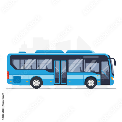 Urban bus parked with city buildings in background, modern public transport. Urban bus transport for city travel. Commercial shot urban bus isolated for transportation design.