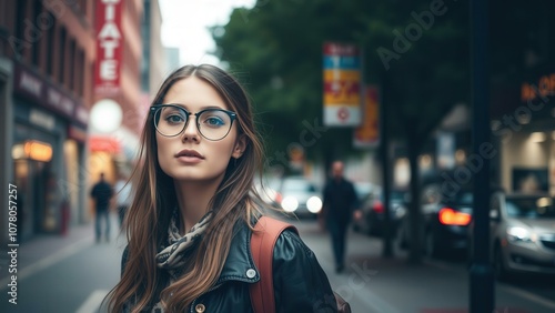 Urban Chic: Young Woman in City Street with Glasses and Leather Jacket, Capturing Modern Lifestyle and Fashion