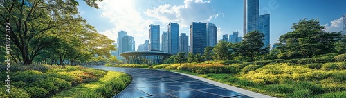 Urban cityscape highlighting sustainable infrastructure with solar pavements