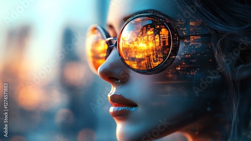 Urban Dreamscape: A Woman's Silhouette Reflected in Futuristic Sunglasses