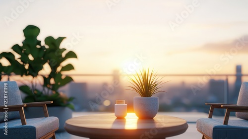 Urban explorations spark rooftop adventures. Cozy balcony scene with plants and sunset view.