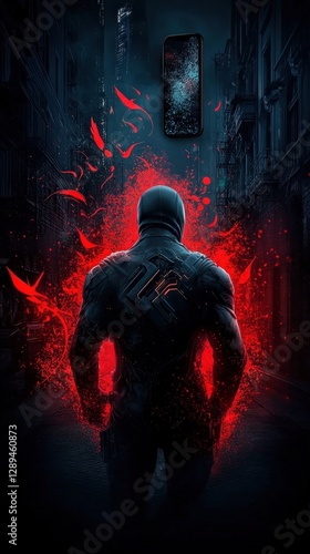 Urban Fantasy Superhero in Dark Alley: Mysterious Figure with Red Glow and Mobile Phone in Cinematic Night Scene. Abstract Phone Wallpaper 9:16