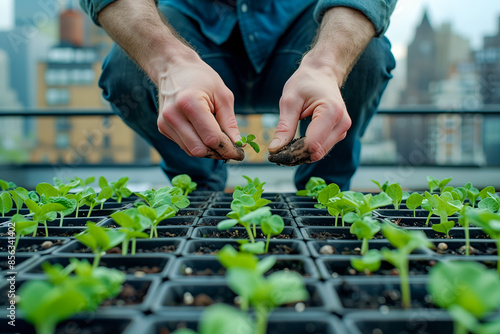 Urban Gardener Planting Seedlings on Rooftop