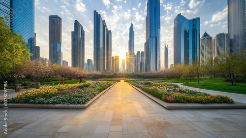 Urban Landscape with Flowers and Sunset Glow