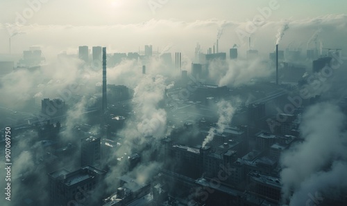 Urban landscapes shrouded in smog, where towering factories loom over neighborhoods, illustrating the toll of industrial emissions on air quality