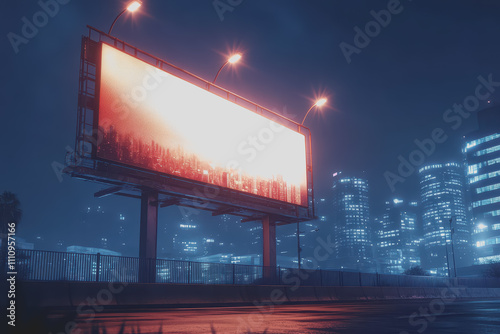 Urban Nightscape Featuring Illuminated Billboard Surrounded by Skyscrapers in a Modern City with Fog and Vibrant Light Reflections