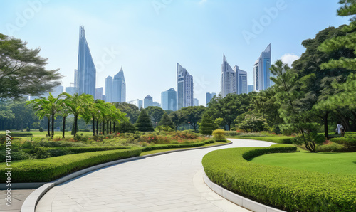 Urban Oasis: Green Park Pathway Amidst Skyscrapers